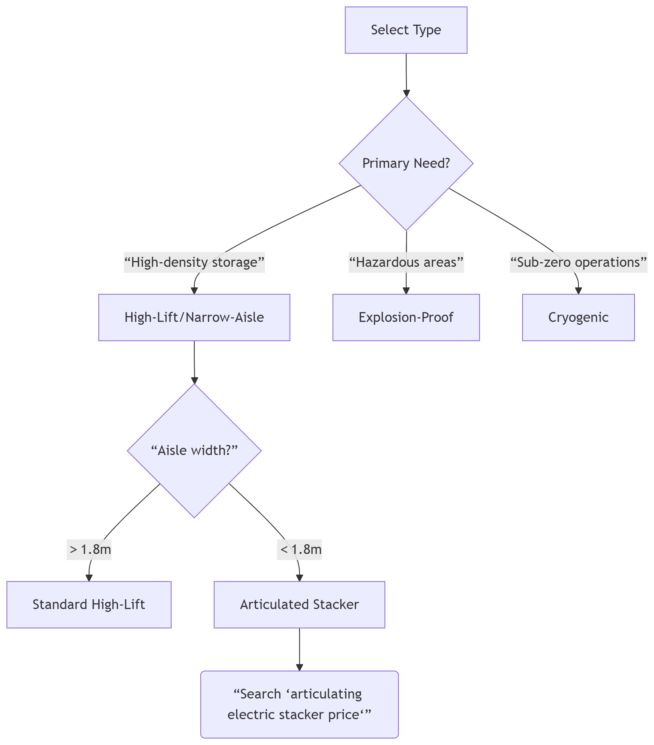 genere Aisle Width Target Keyword Tri-Directional 1.6-1.8m "tri-directional electric stacker"Articulated 1.4-1.6m "articulating narrow reach truck"3. Explosion-Proof Electric Pallet Jacks